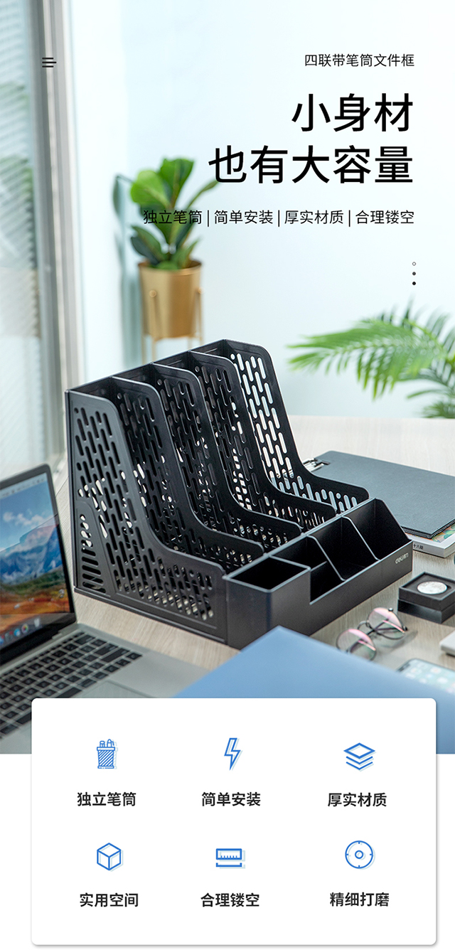得力(deli)4联带笔筒收纳桌面文件框书立办公室桌面多层资料架子多功能镂空文件架黑色78981