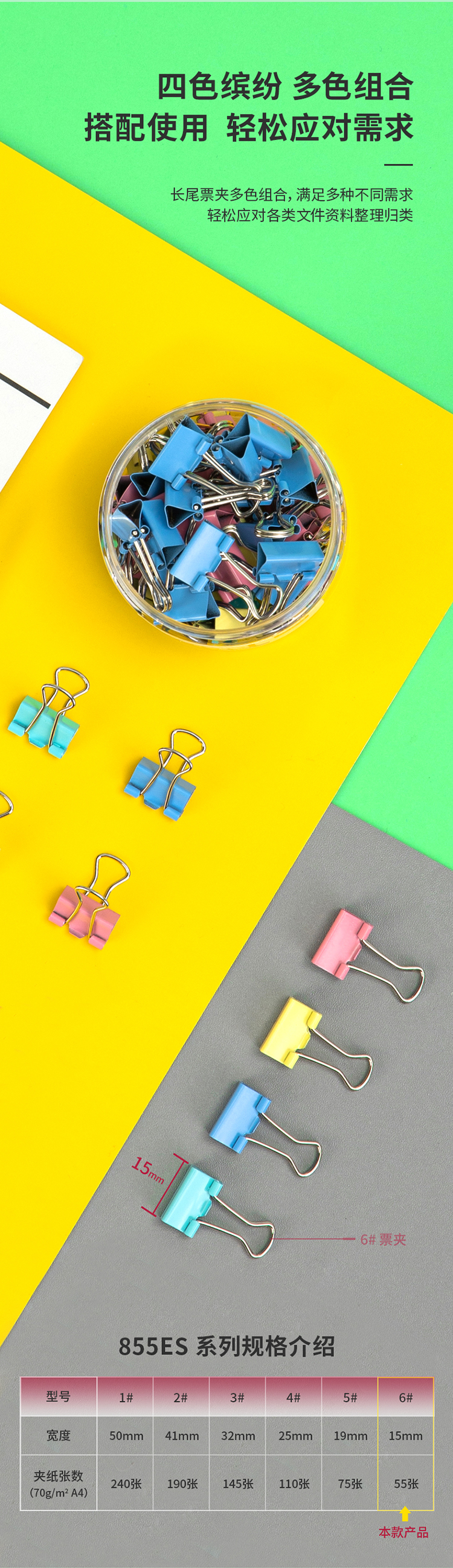 得力(deli)60只15mm彩色长尾夹票夹6#小号金属燕尾夹票据文件夹子办公用品8556ES