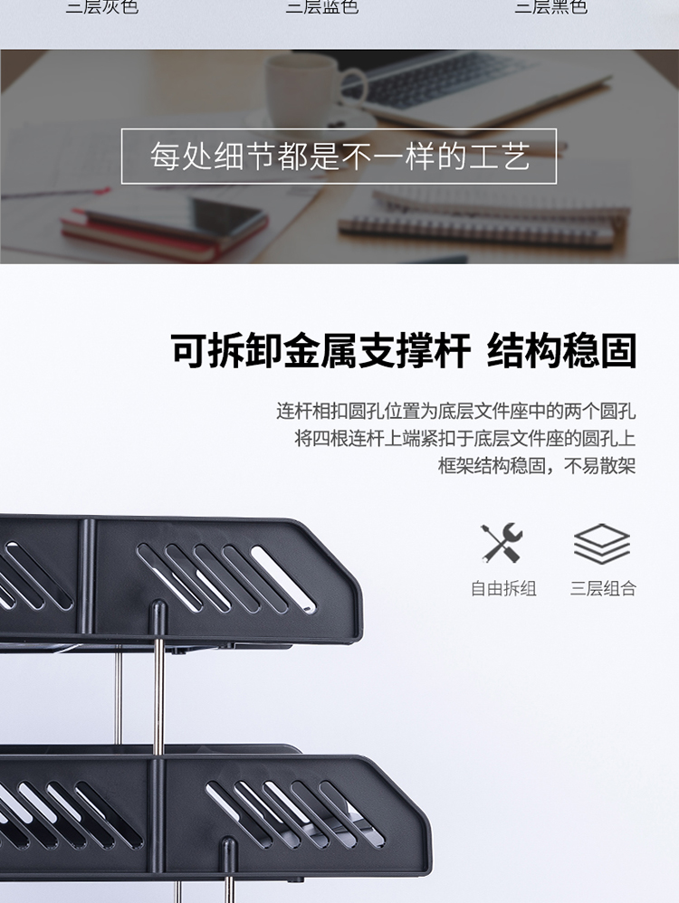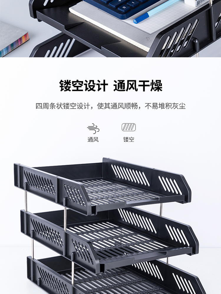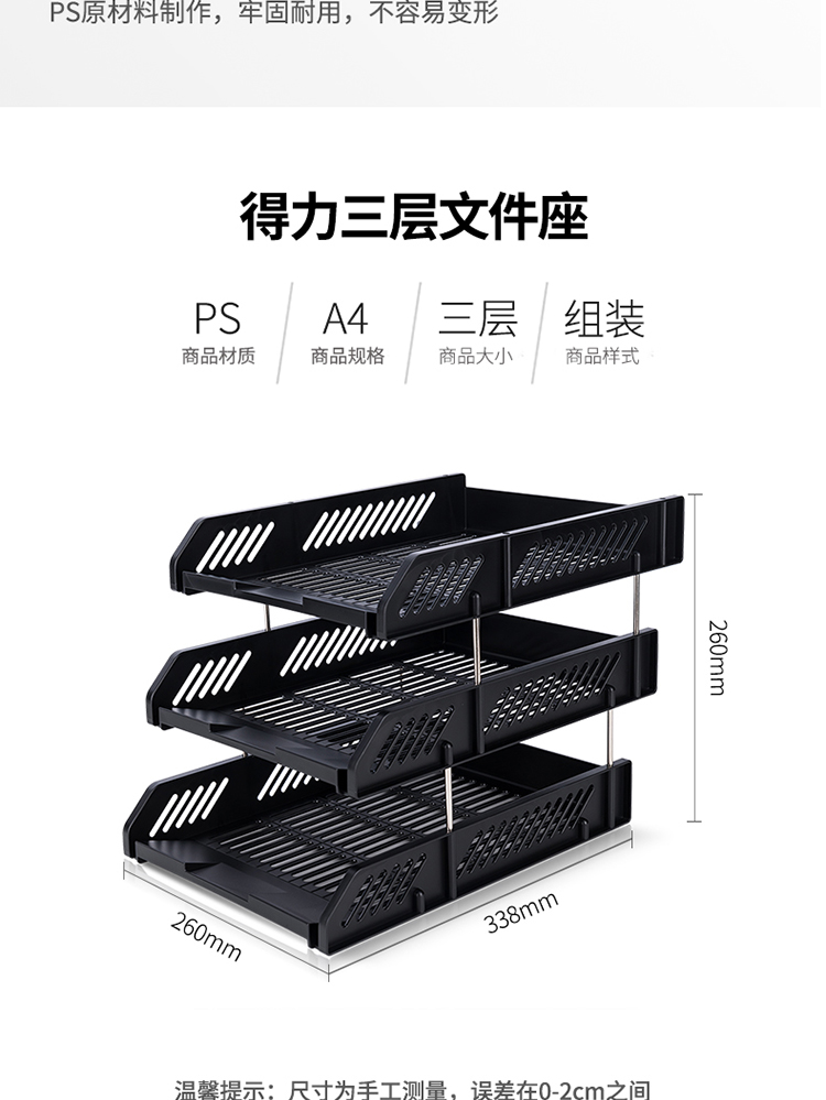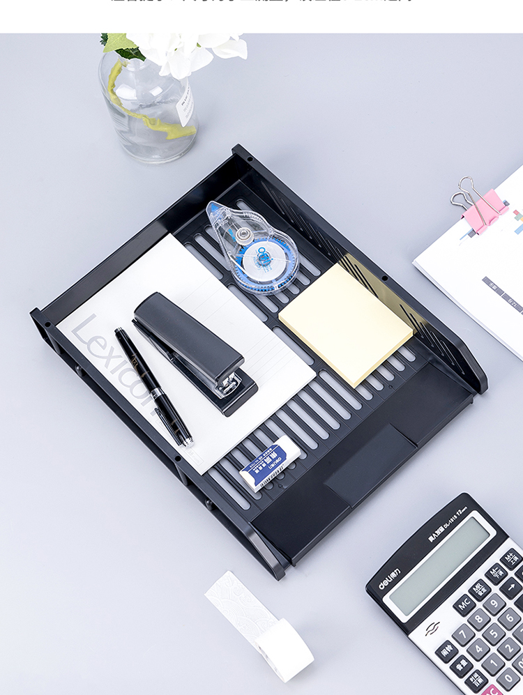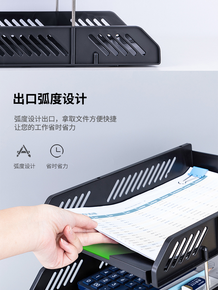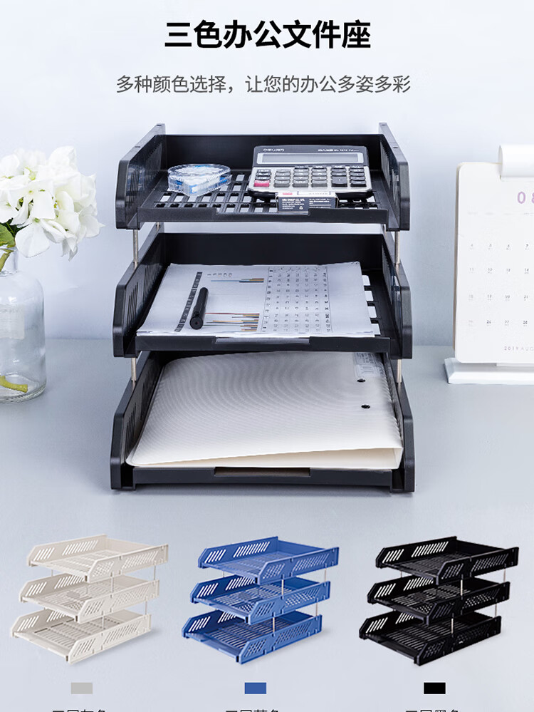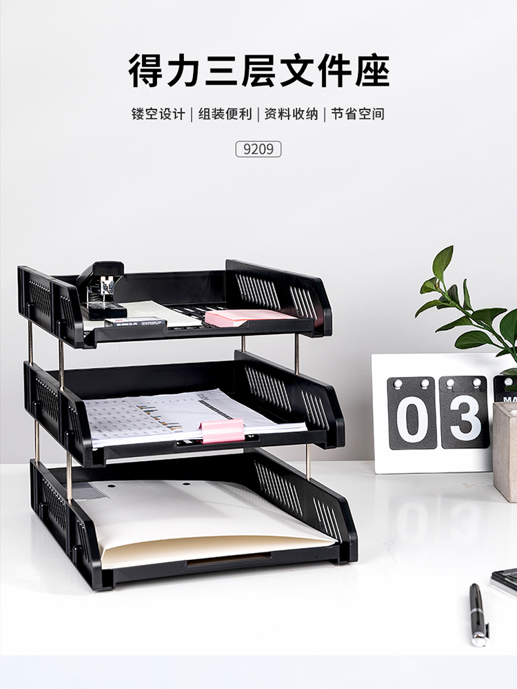 得力(deli)三层镂空收纳文件座自由拆卸组装三层文件盘/文件框牢固耐用桌面文件管理黑色9209